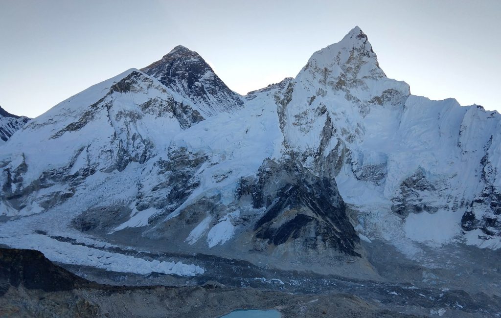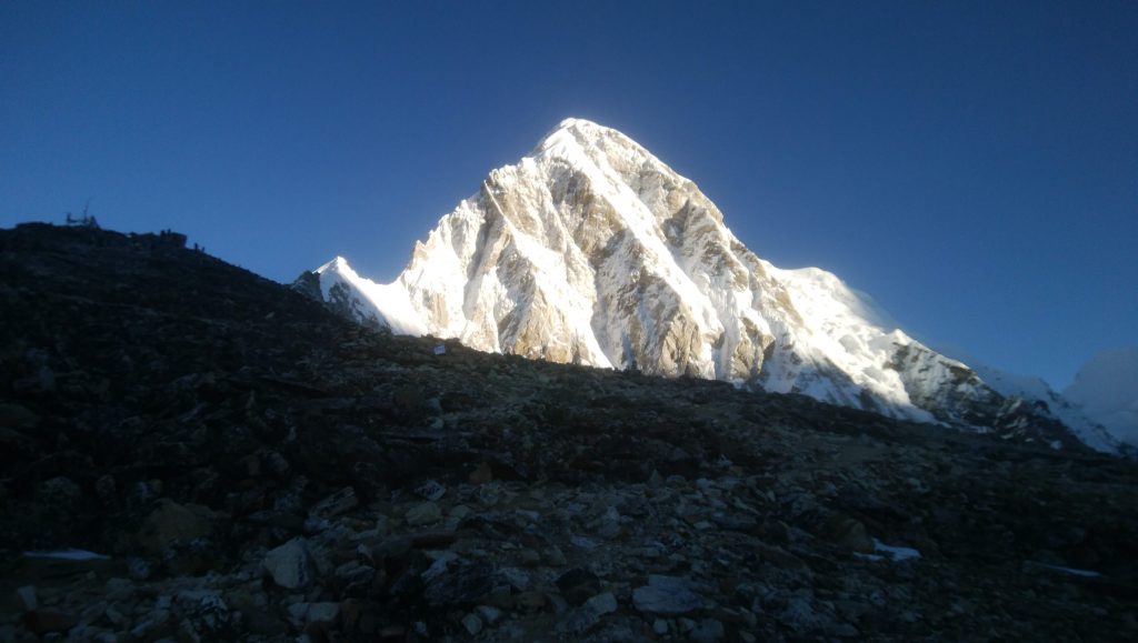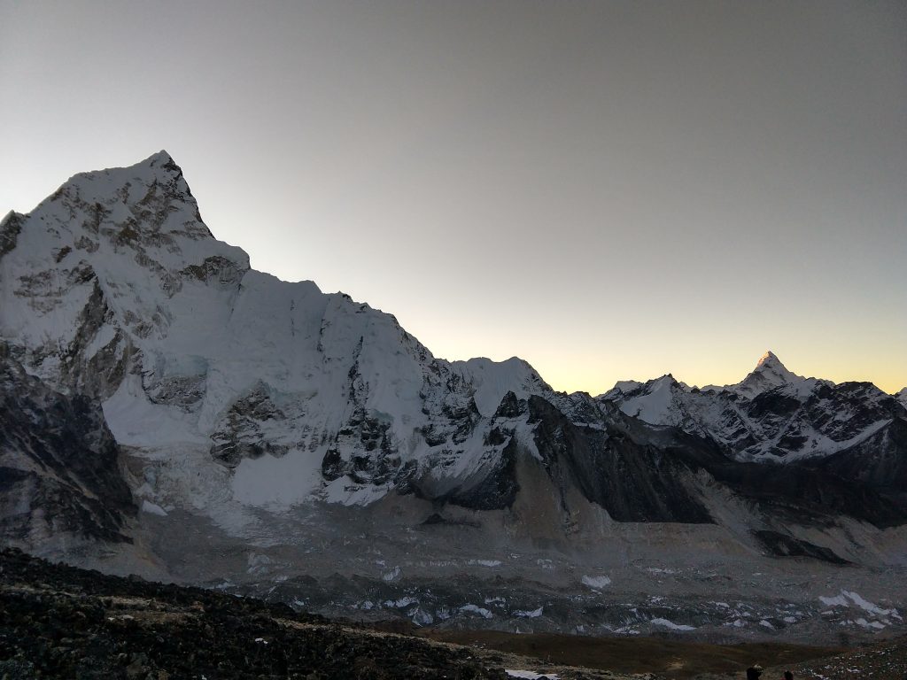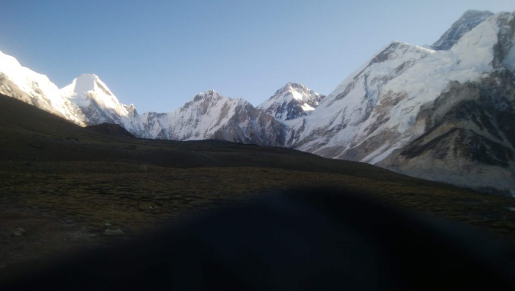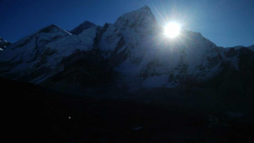 ふと明るくなったほうに目をやるとヌプツェの隣にはっきりと、これまではその姿をしっかりと見ることができなかったエベレストの姿をこの目でとらえることができました。
