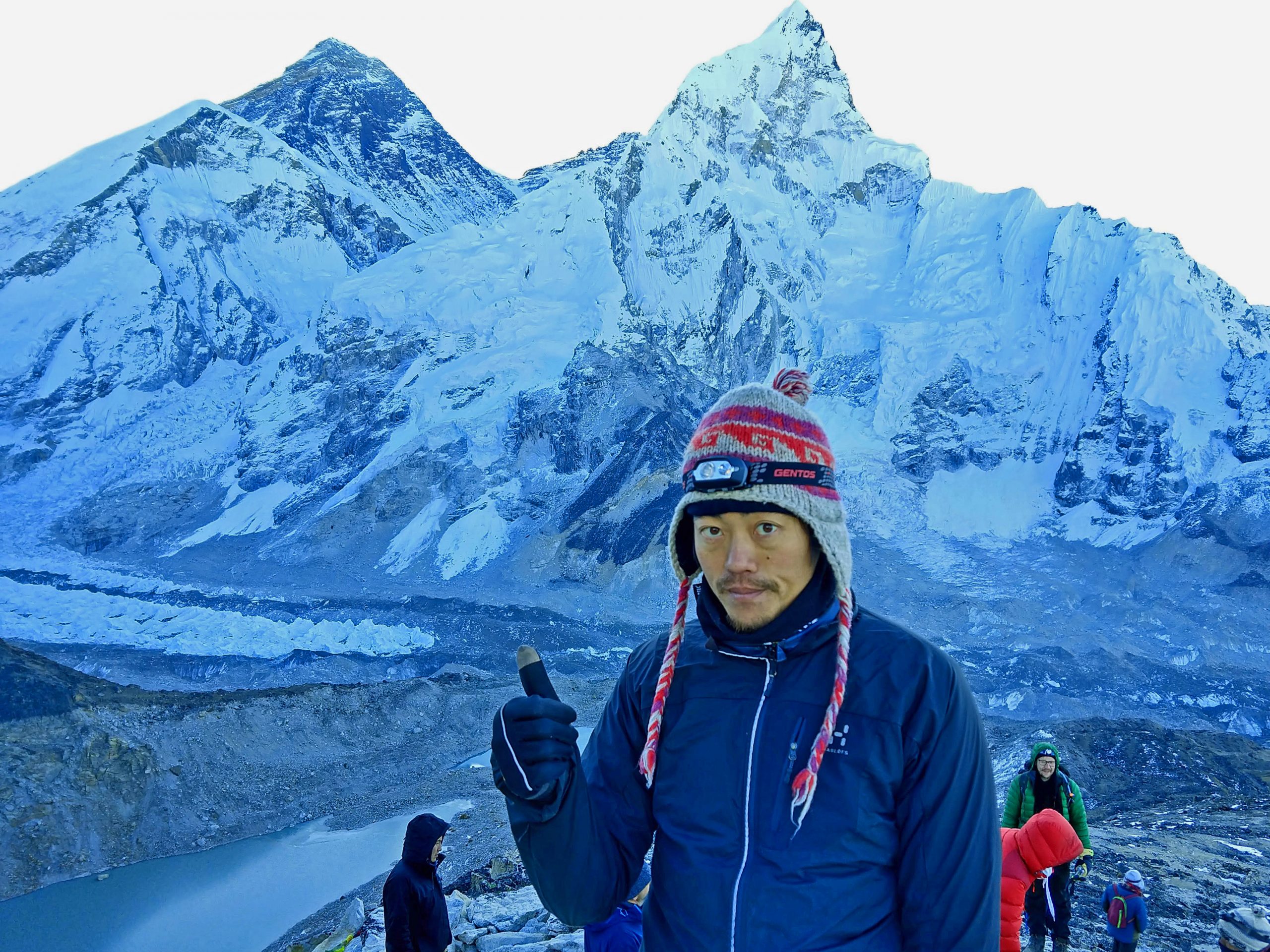 エベレストの姿にすばし見入るZ君。後ろの山はプモリ。