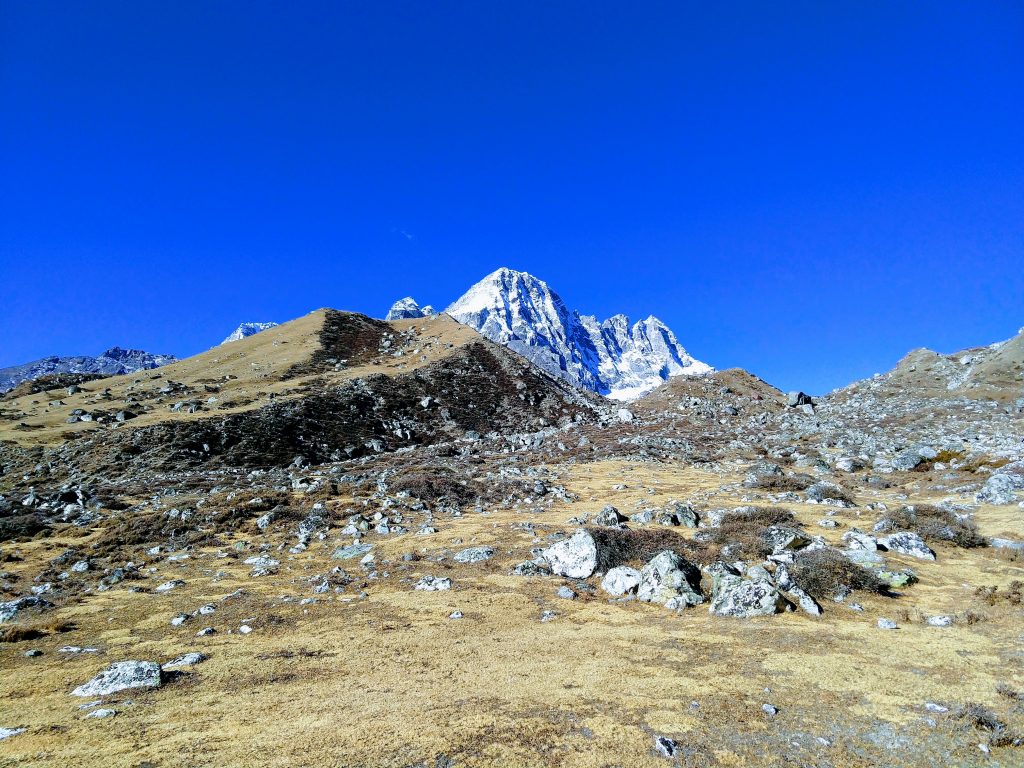 そして右側の雪山が世界第6位の高峰チョ・オユー Cho Oyu(8201m)です。8000mの中ではもっとも登りやすい山の一つとされています。
