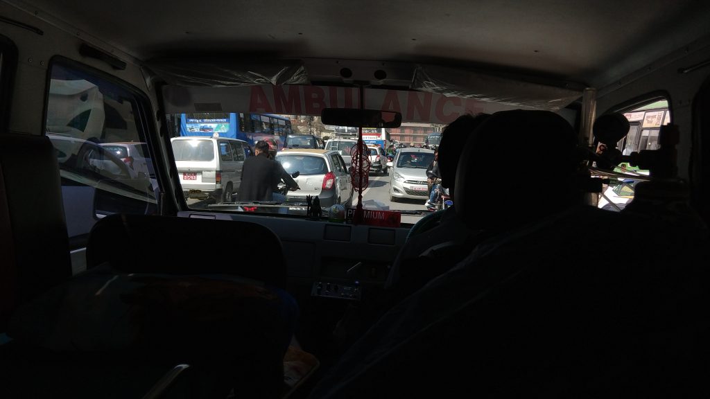 カトマンズの大渋滞の中、サイレンを鳴らして、当たり前のように反対車線を走る救急車。