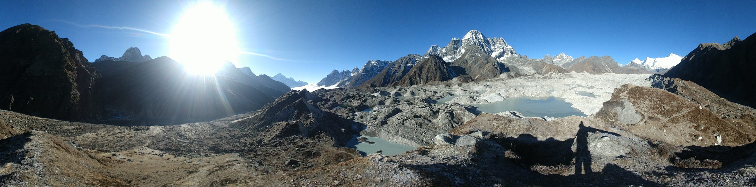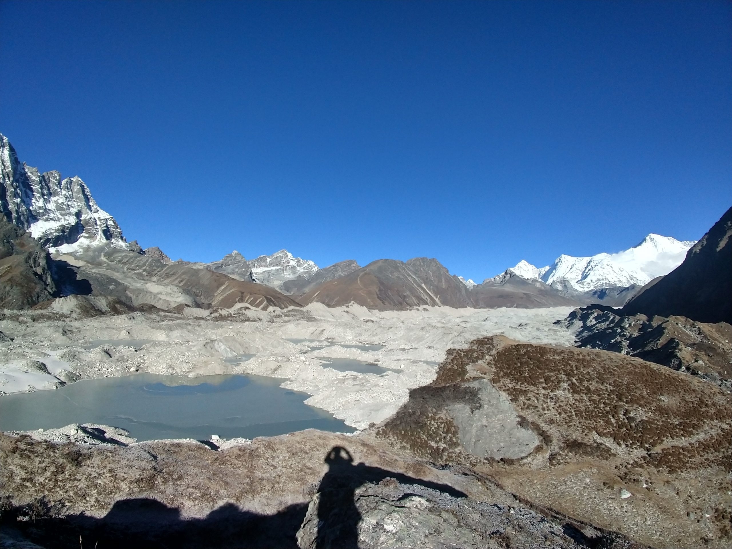 手前の氷河はヒマラヤで最も長いンゴズンパ氷河 Ngozumpa Glacierです。この氷河はまさにチョ・オユーにその源があります。