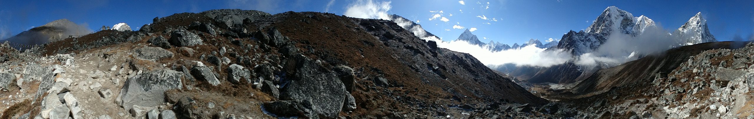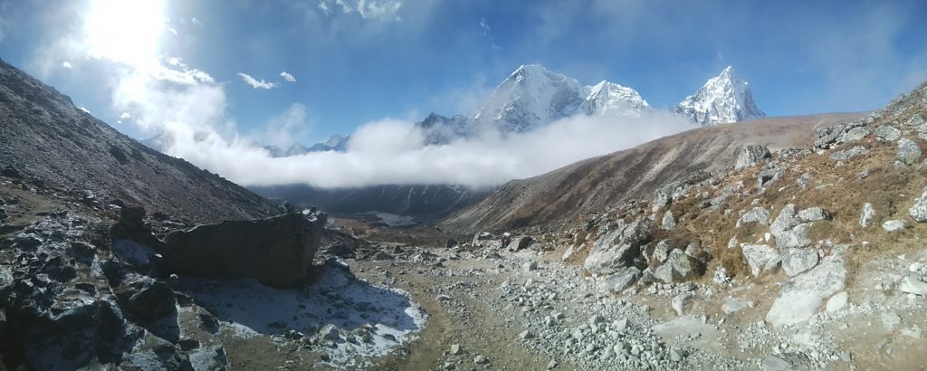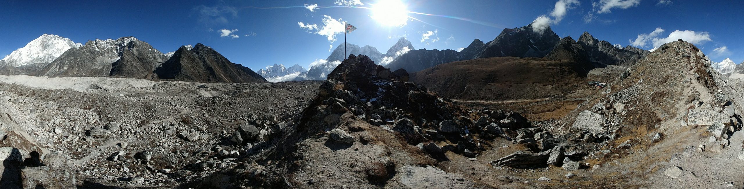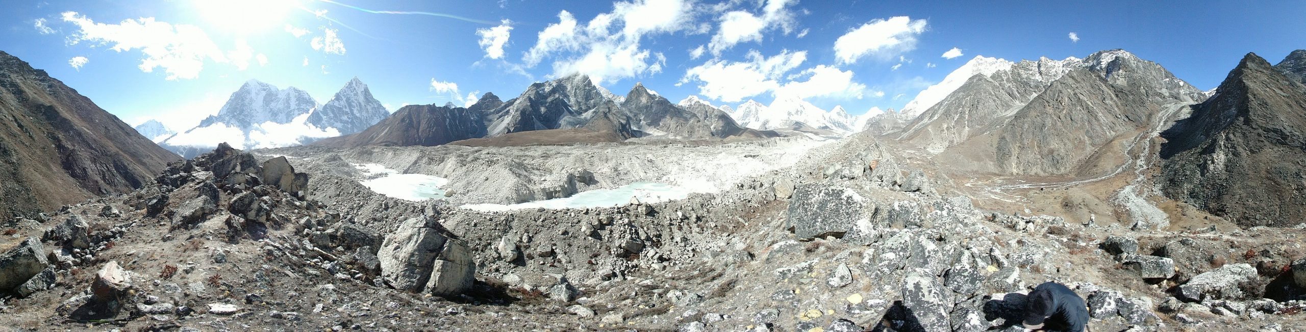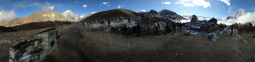 パノラマ写真の左側が氷河の中、右側がロブチェの村です。そしてそれを隔てる石礫の丘陵部、この写真を撮影している場所がサイドモレーンです。