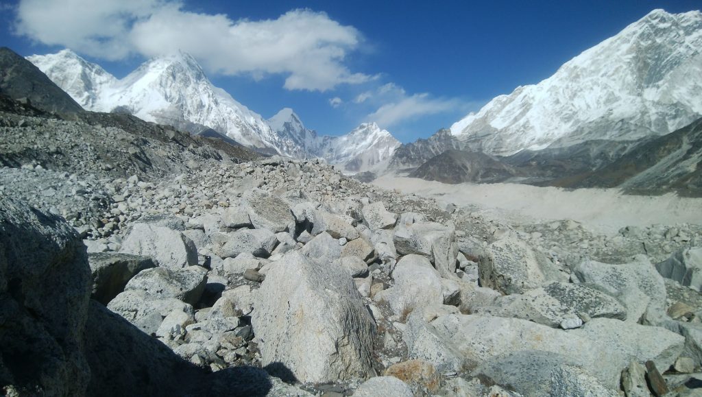クーンブ氷河の上流を見たところ。この氷河が右に曲がっていった先にエベレストがあります。