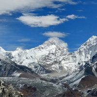 中央左手の見事な三角形の山がプモリ Pumori(7161m)、中央の小三角がリントレン Lingtren(6714m)、その右がエベレストのすぐ北にある山クンブツェ Khumbutse(6636m)です。