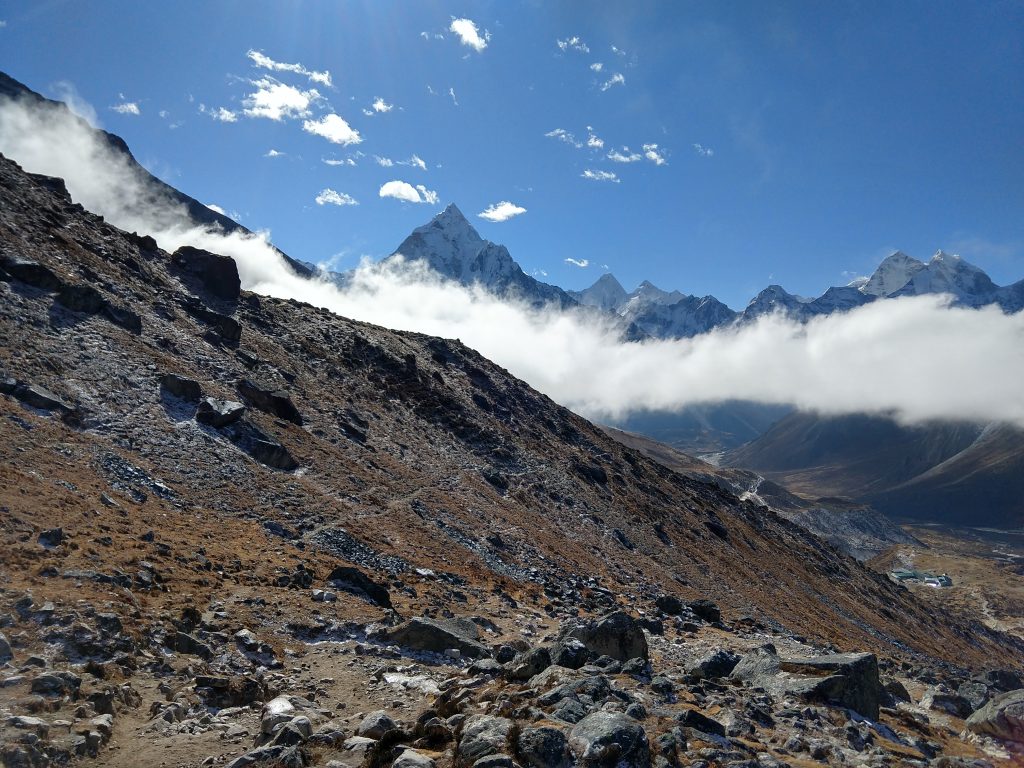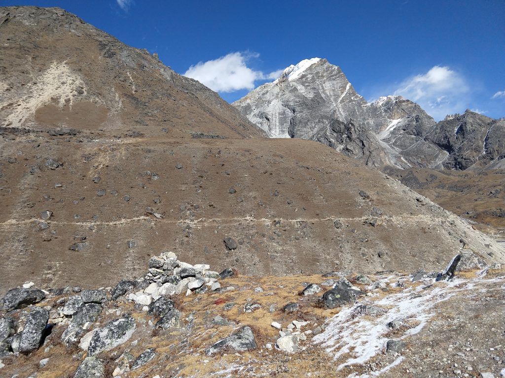 手前の斜面の中腹に白く見えている道がエベレストベースキャンプからの帰りに通るチョラパスへ向かう道です。