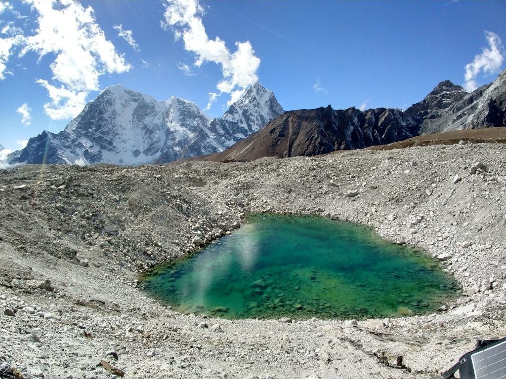 エンドモレーンとは氷河が押してきた岩石などの堆積物の集まりなのですが、さすがにエベレストから流れ出てくるクーンブ氷河の堆積物ともなると一つの丘になる程の規模になります。