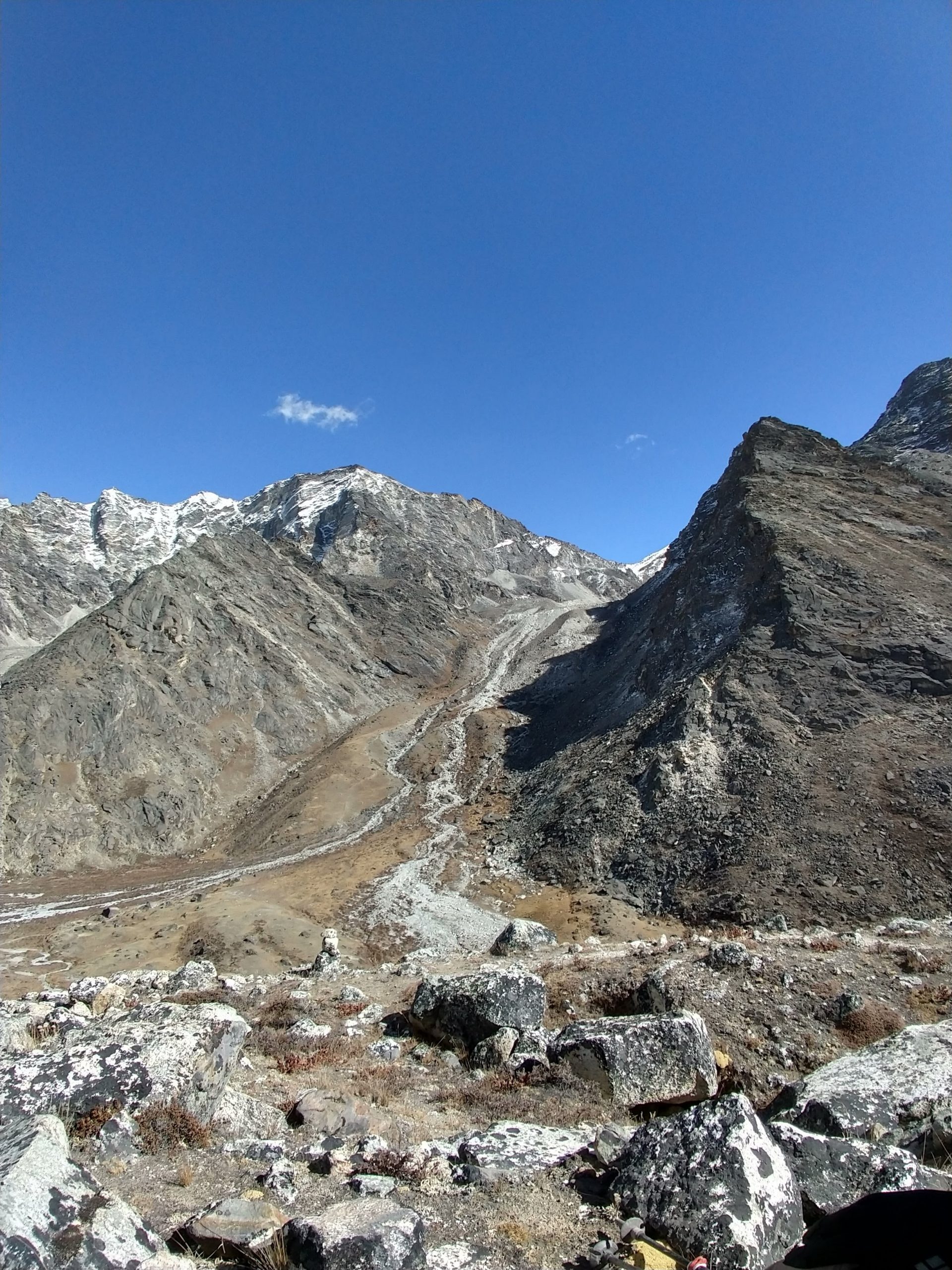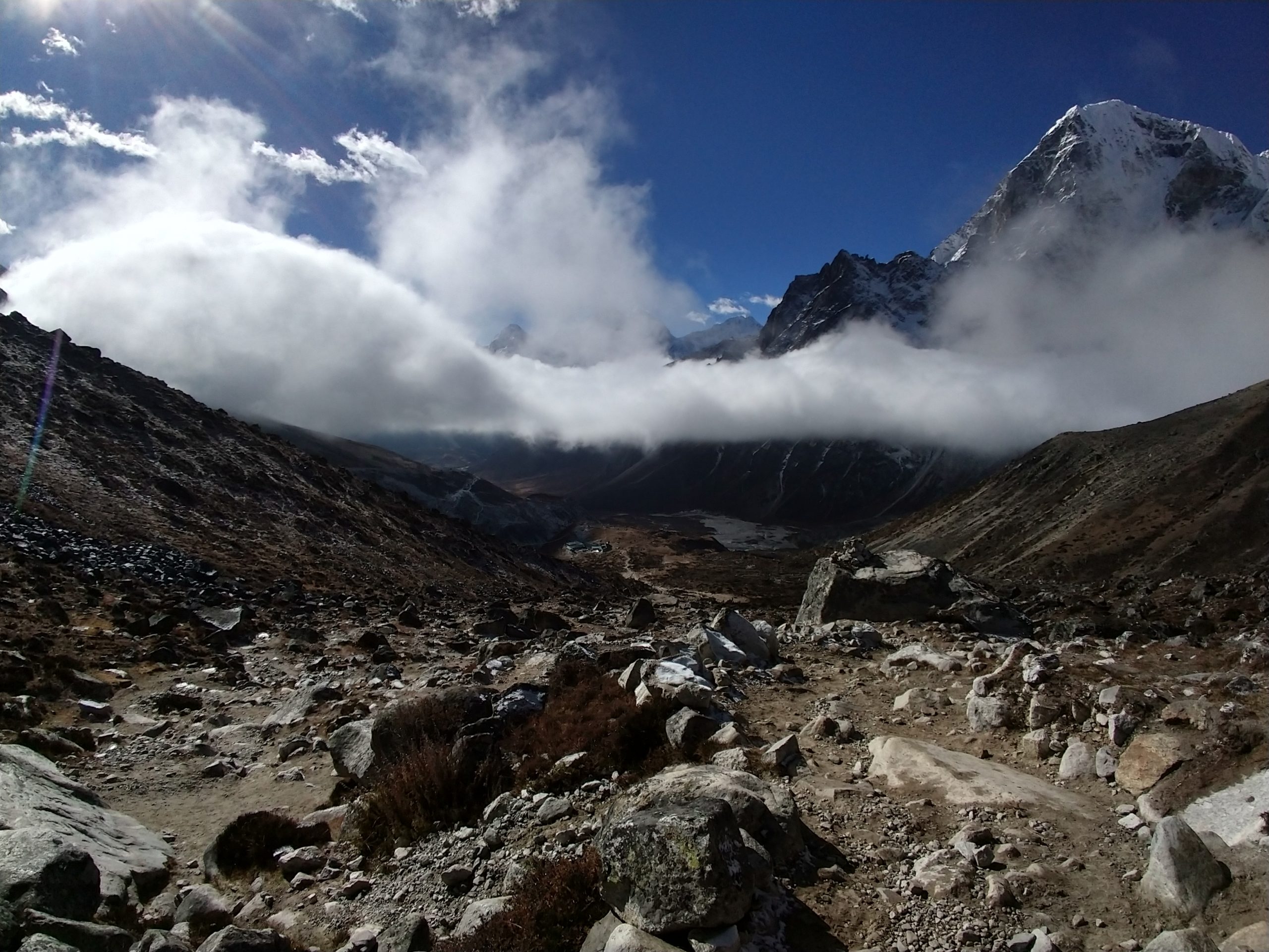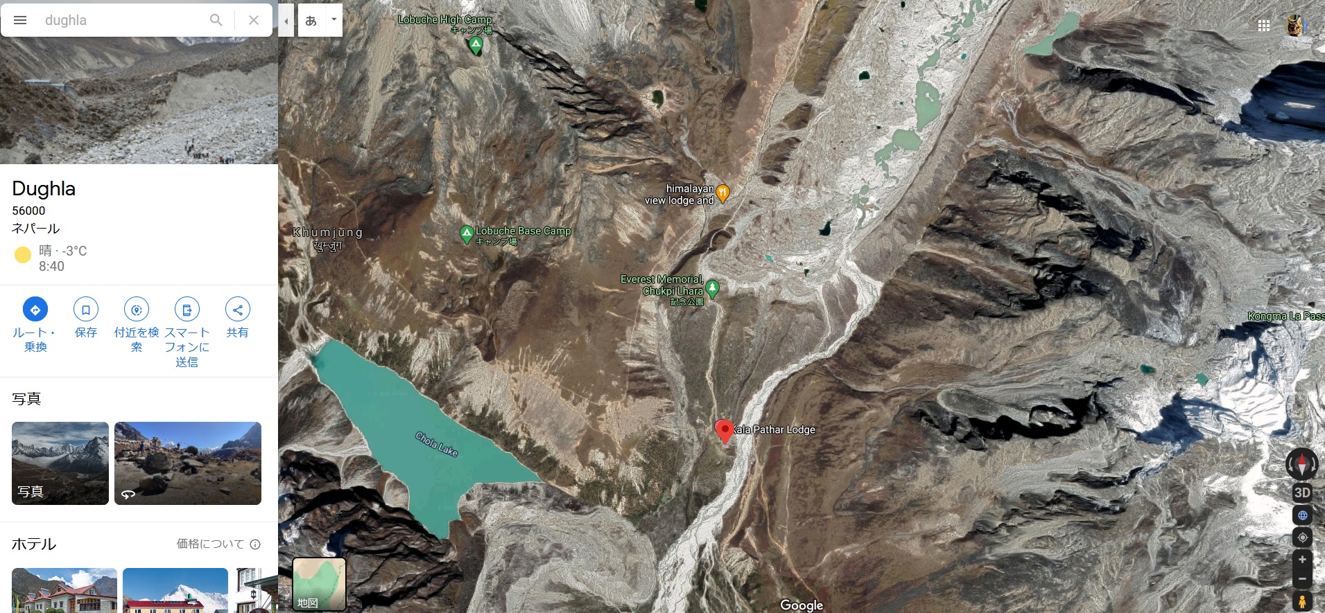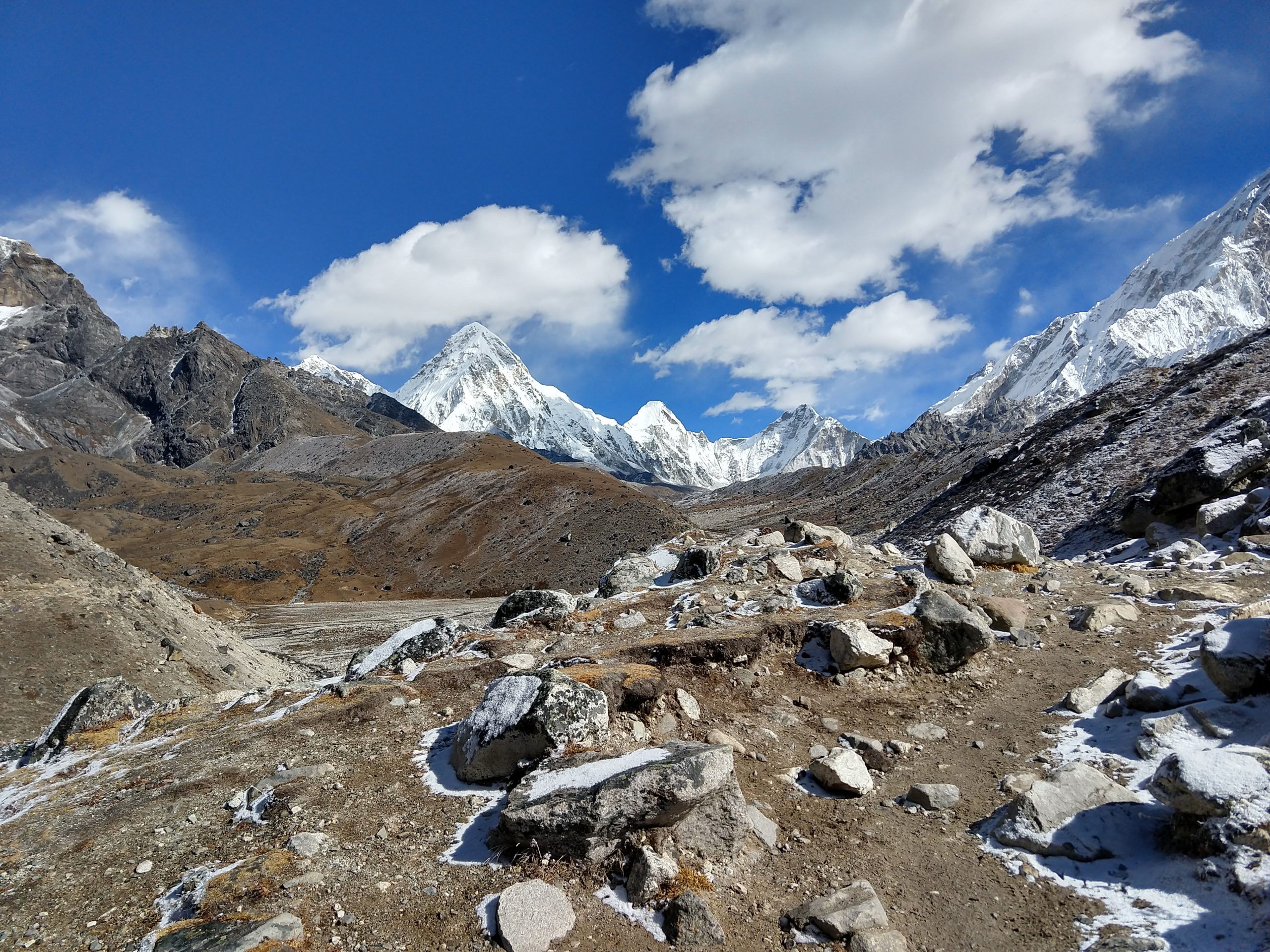 この位置からはうっすらとしか見えませんがプモリの麓にはカラパタール Kala Patthar(5644m)というエベレストの展望台として知られている丘があります。
