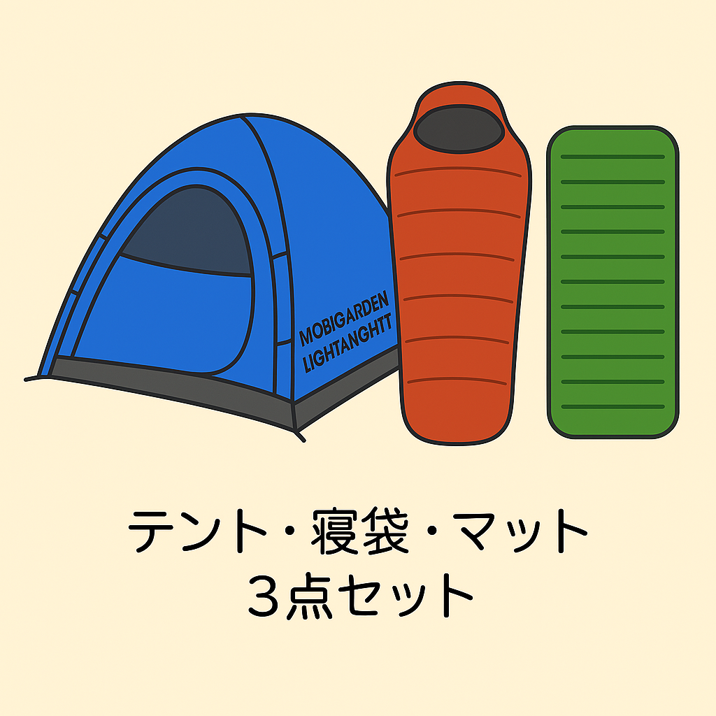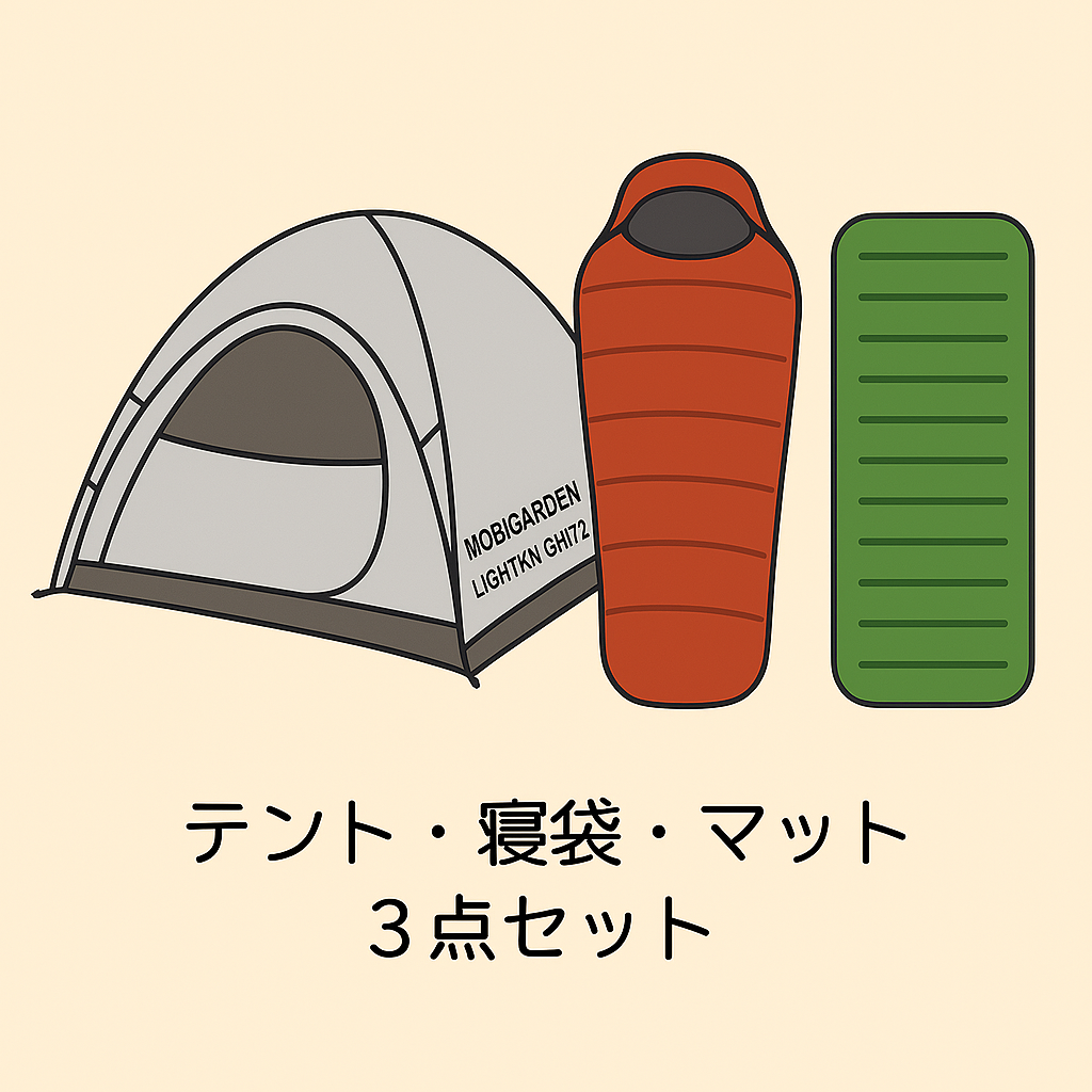 セット内容・1人用テントMobiGardenLIGHTKNIGHT ul1・寝袋(イスカ アルファライト500x(最低温度0度))・スリーピングマットNEMOスイッチバックレギュラー
