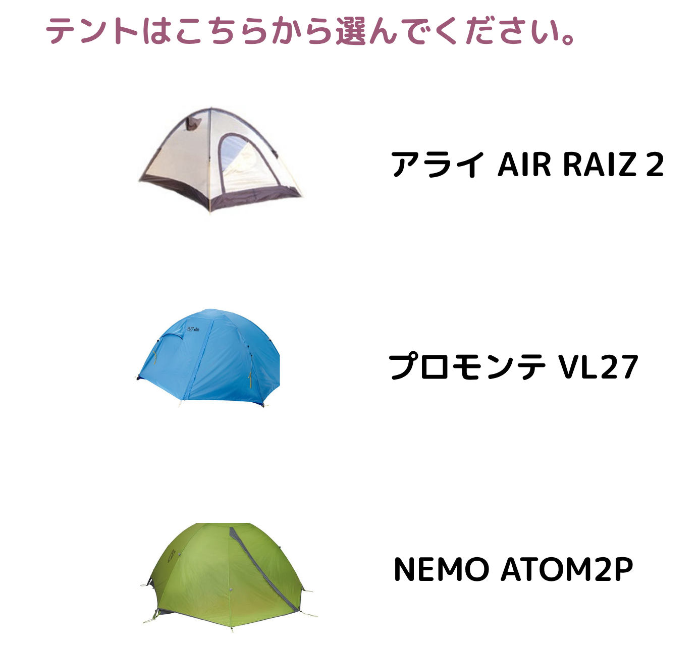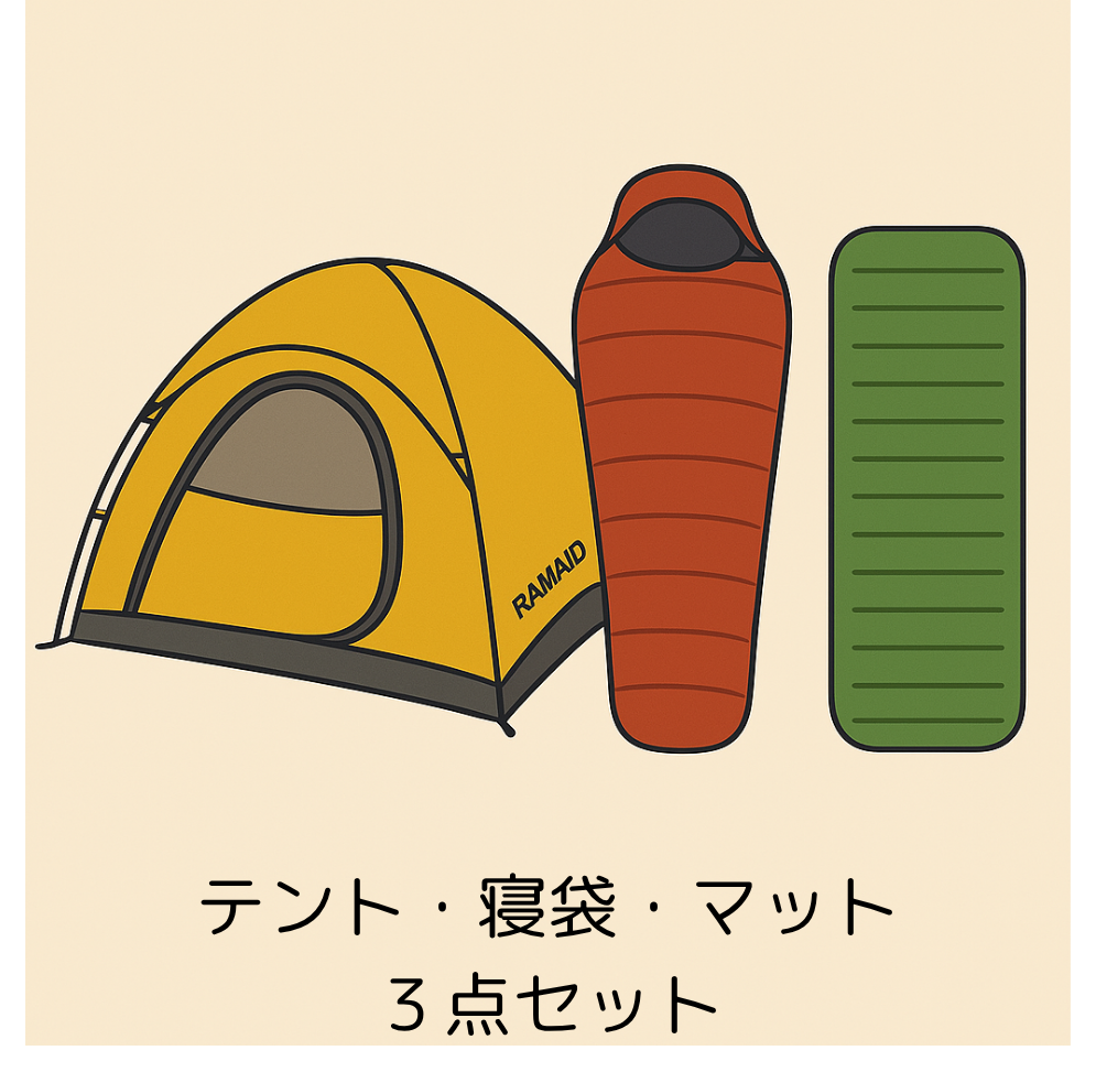 山岳用テント(アライ AIR RAIZ2/プロモンテ VL27/NEMO ATOM2)と寝袋(イスカ アルファライト500x(最低温度0度)スリーピングマット(NEMOスイッチバックレギュラー)3点セットです。24時間:9900円~